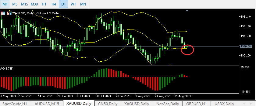 今日の金価格は一時下落し、ドル指数が依然として非常に強い状況にあるため、ボルバンドの中間線に接触しています。市場データは、FED が近い将来にも利上げを行う予定であることを示しています。 米国の金融データは非常に好調です。たとえば米国のPMIは54.5に上昇し、2023年2月以来の最高値となった。多くの銀行家は、強い米ドル指数が市場の主要な状況であると考えています。