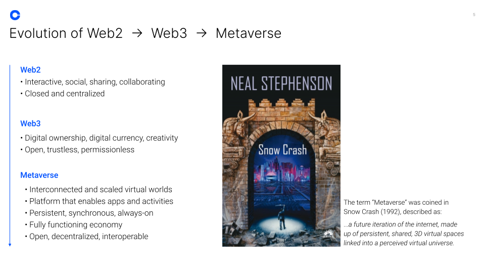 در Coinbase، تفکر ما در مورد Metaverse به شدت تحت تأثیر متیو بال، سرمایهدار و نویسنده خطرپذیر قرار گرفته است (میتوانید کارهای او را در اینجا بیابید). مانند مت، متاورس را به صورت زیر تعریف می کنیم: