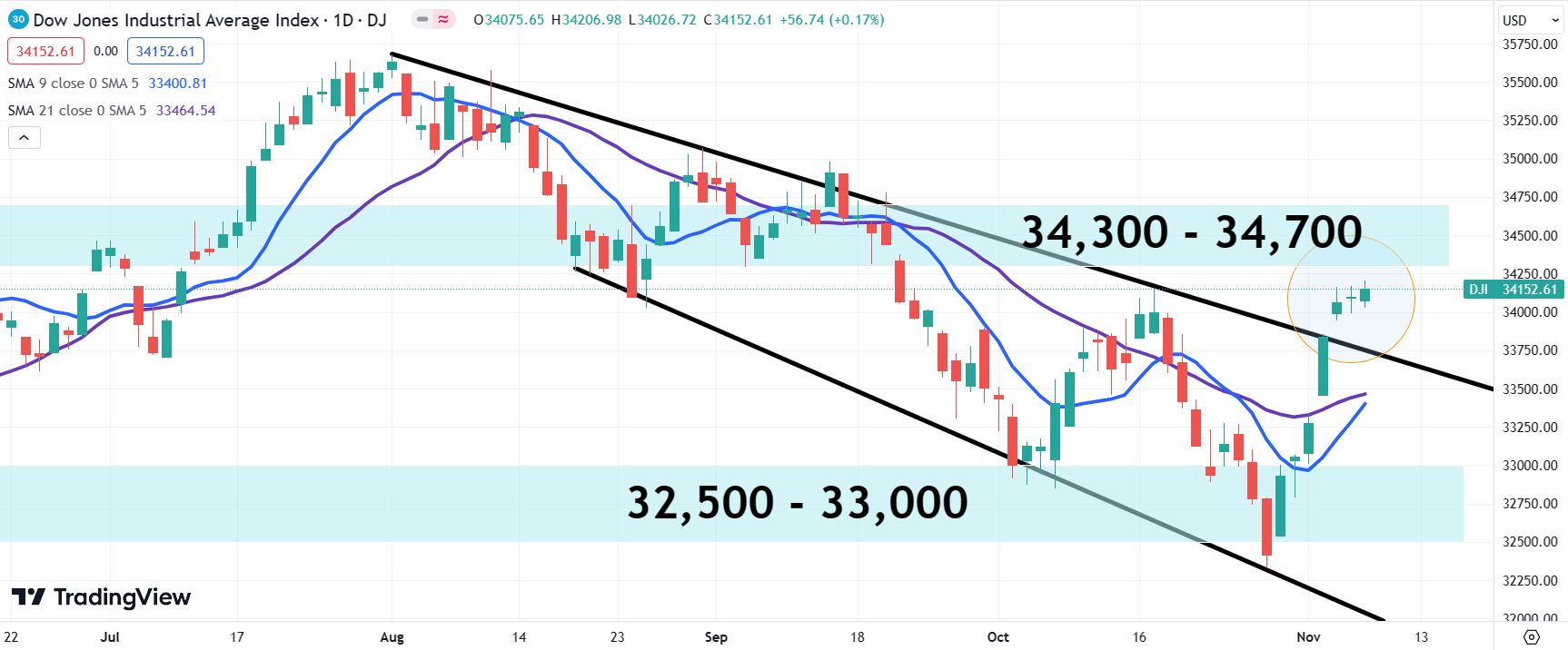 The next stage will likely see the Dow Jones index reach resistance within the 34,300 to 34,7000 volume band. This region has acted as both support and resistance for most of 2023, so it is viewed with real significance. Bulls will look to enter once this week’s rally pulls back to retest the top trendline of the former price channel.