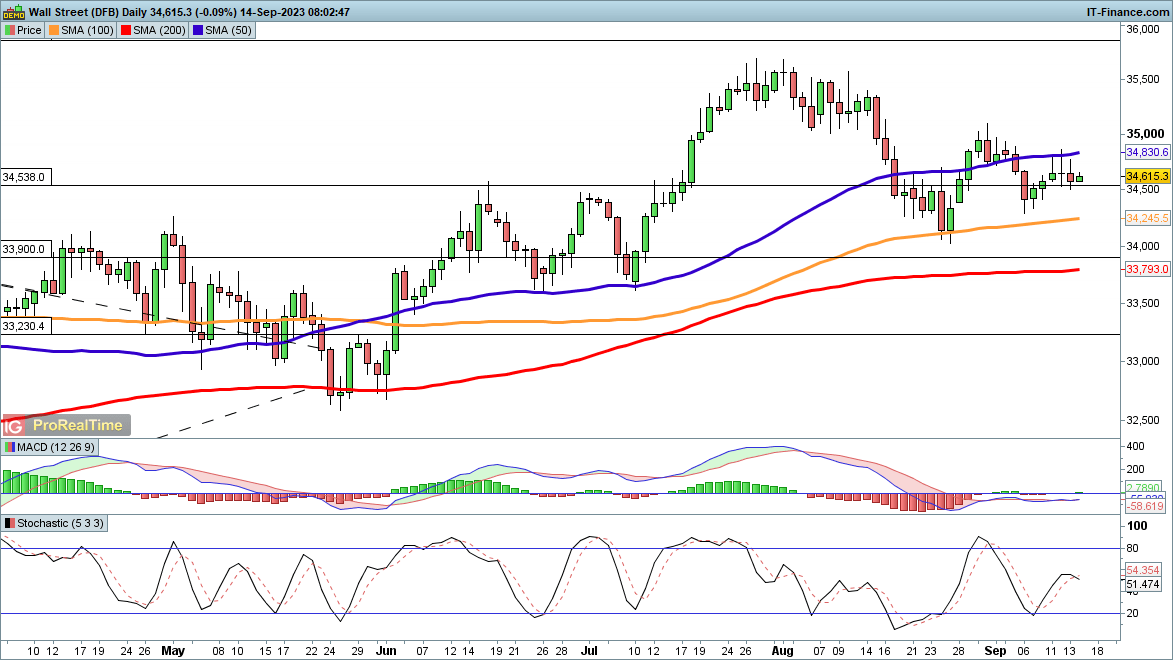 The index has spent the week trying to break higher, but gains above 34,700 have proven impossible to sustain. For the moment, while the buyers have not been able to seize control, sellers have been unable to drive the price lower, with 34,540 acting as an area of support. Last week’s low at 34,280, and then the late August low around 34,050 could provide support.