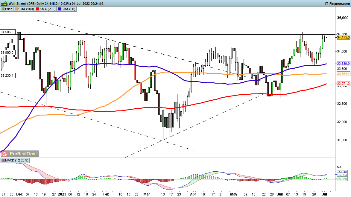 این شاخص یک بار دیگر به سطح 34000 صعود کرده است و درست پایینتر از بالاترین قیمت ژوئن قبلی خود قرار دارد. بالای 34500 هدف بعدی 35000 خواهد بود.