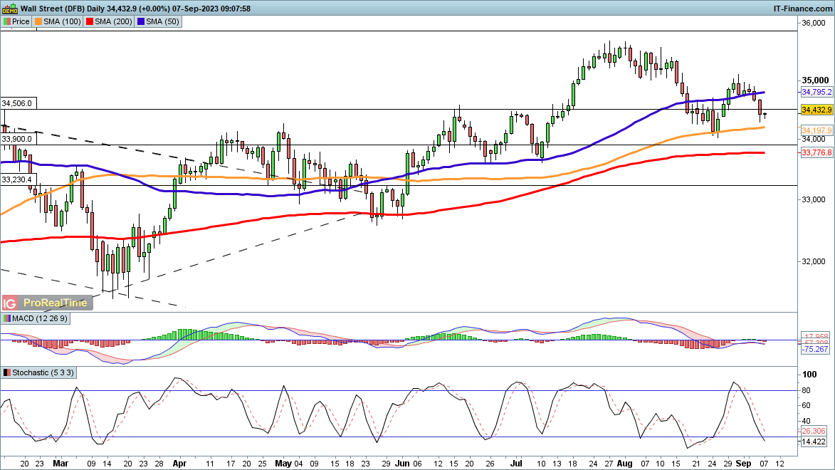 ​The index has fallen this week, dropping back below the 50-day SMA and heading towards the 100-day SMA.​It remains above the August lows, but bulls will need a close back above 34,750 to suggest that a new leg higher has begun, which might then see the index target 35,000, followed up by the late July peak at 35,640.