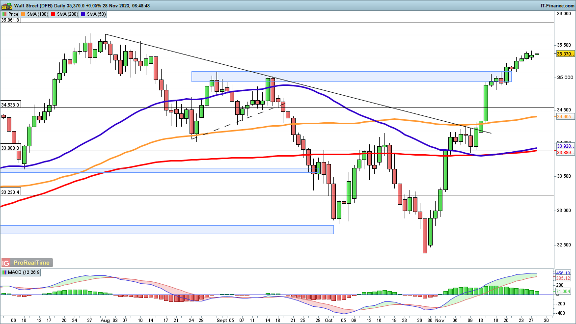 The rally has slowed in recent days, though sellers have been unable to establish control even in the short-term timeframes.Further gains continue to target the summer 2023 highs above 35,600, while beyond this the 2022 peaks at 35,860 become the next target.