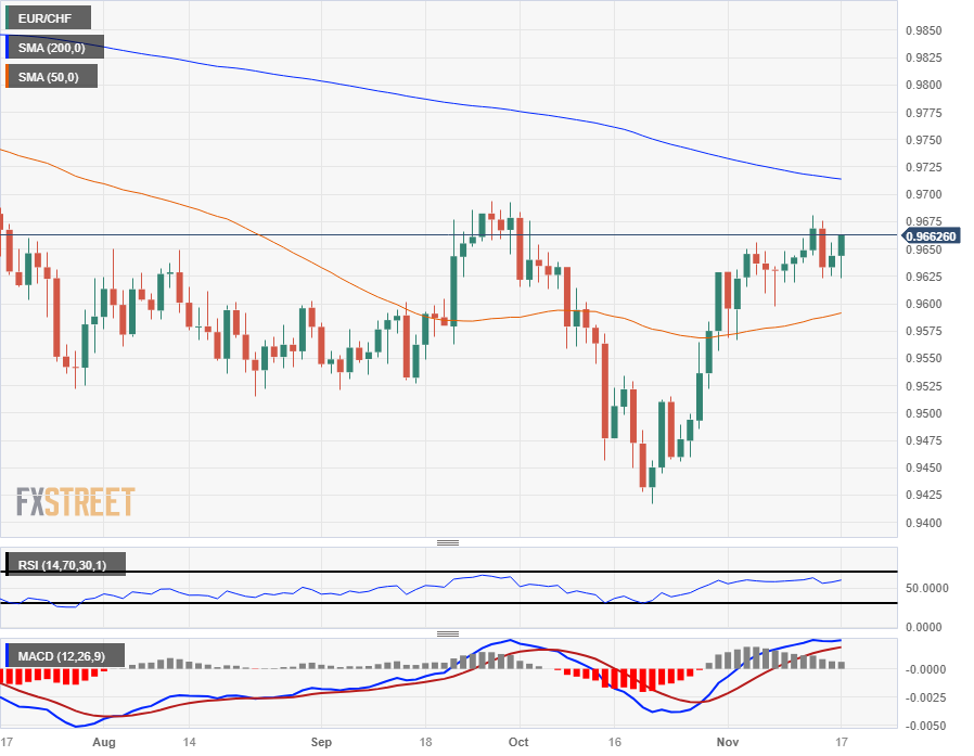 The EUR/CHF dipped to a new low for the week at 0.9623 in early Friday trading before markets saw a broad-base tilt back into risk-on mode, pushing risk assets higher and sending safe havens lower to round out the week’s trading.