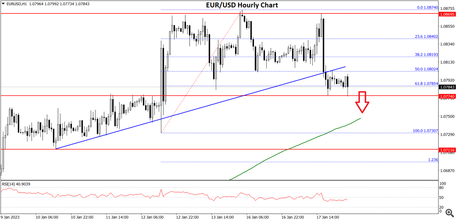 · در نمودار ساعتی EUR/USD یک شکست به زیر خط روند صعودی کلیدی با حمایت نزدیک به 1.0800 وجود داشت.
