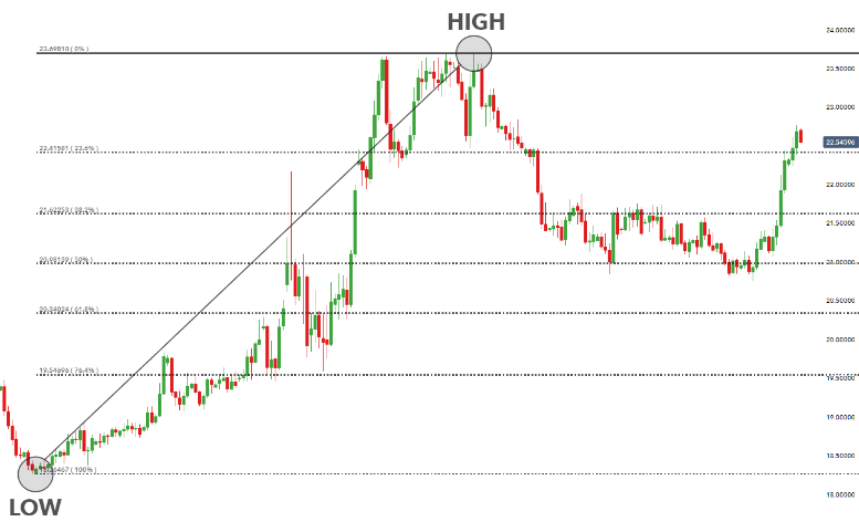 معامله گران همچنین ممکن است از اصلاح فیبوناچی از a استفاده کنند زیاد تا پایین سطح قیمت همانطور که در USD/SGD نمودار زیر