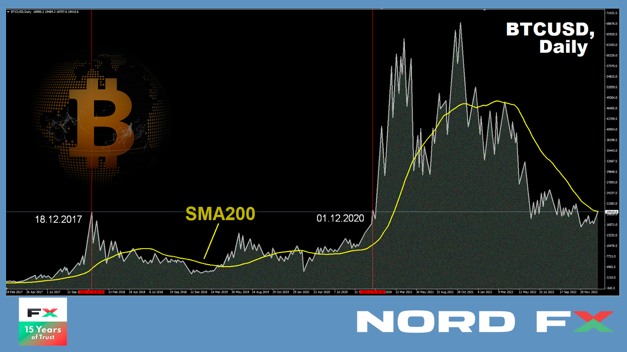 ● BTC/USD has once again returned to the $18,500-20,000 area. This zone acted as support since last June, and it turned into resistance in November. The pair traded there in December 2017 as well, after which a protracted crypto winter followed. Bitcoin was able to return to these values only three years later, at the end of November-December 2020. This rise marked the beginning of a powerful bullish rally then: the coin rose in price by 3.5 times in less than six months, reaching $64,750 in April 2021. This was followed by another collapse.
