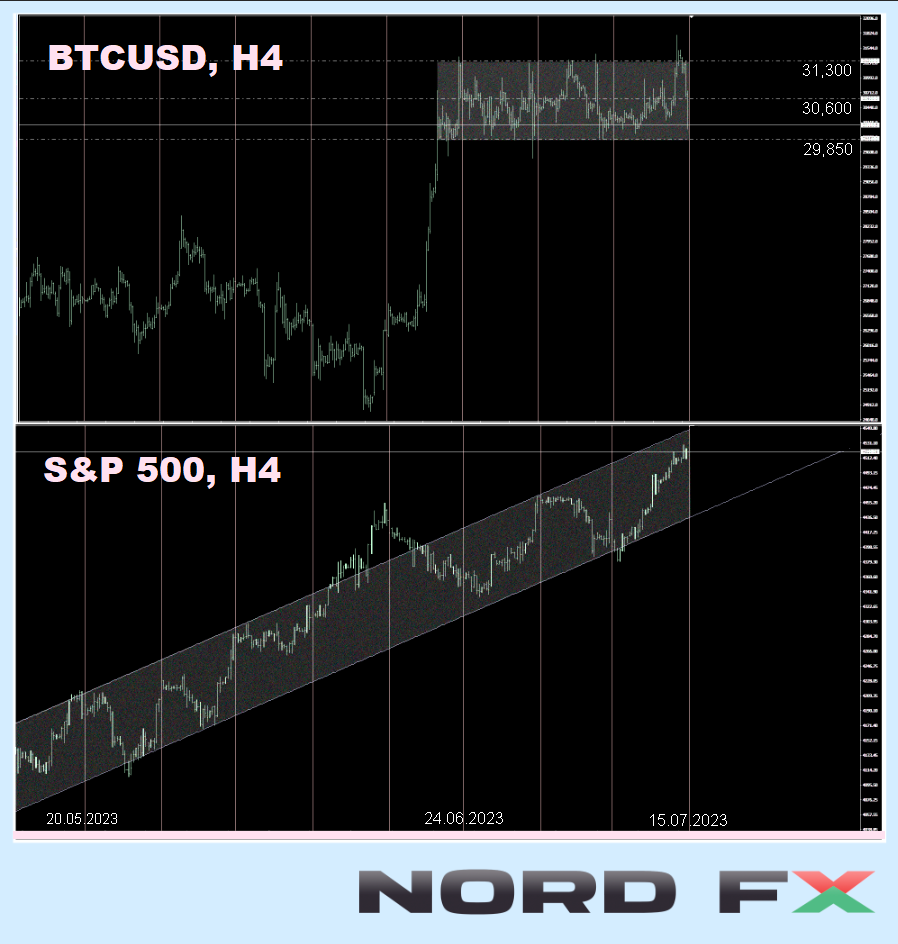 ● After the release of impressive consumer inflation data in the US last week, the markets became confident in the Fed’s imminent abandonment of monetary restriction and a turn towards lowering the key rate. The dollar responded to this with a sharp fall, and risky financial instruments – with growth. The S&P500, Dow Jones, and Nasdaq Composite stock indices went up, but not bitcoin. The BTC/USD pair continued to move sideways along the Pivot Point $30,600, trapped in a narrow range. It seems as if it has completely forgotten about its direct correlation with stocks and its inverse correlation with the dollar. On Thursday, July 13, after the release of the American PPI, bitcoin still tried to break through to the north, but unsuccessfully: the very next day it returned within the limits of the sideways channel.