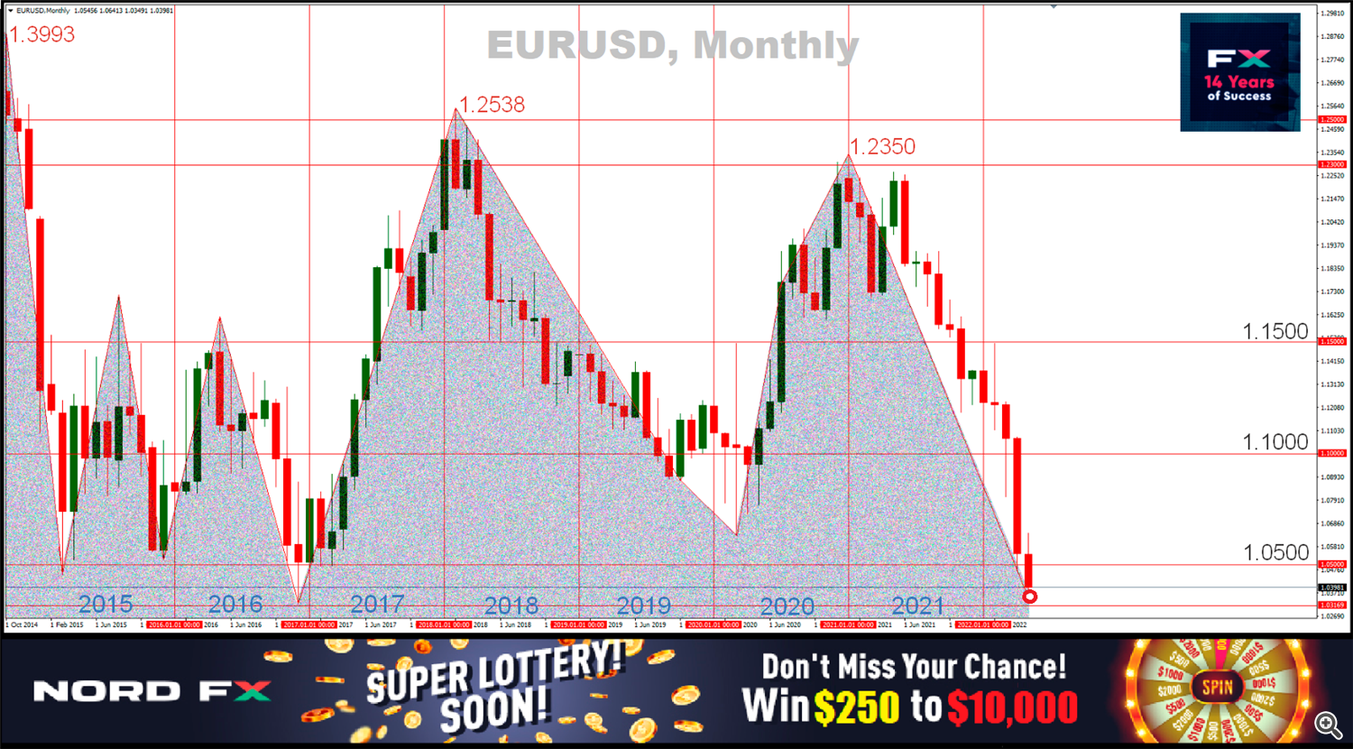 [ad_1] EUR/USD: On the Way to 1.0000 ● The dollar continues to rise, while the EUR/USD pair continues to fall. The DXY dollar index crept close to 104.9 on Thursday, May 12. The last time it climbed this high was 20 years ago. The pair found the bottom at the level of 1.0349, in the