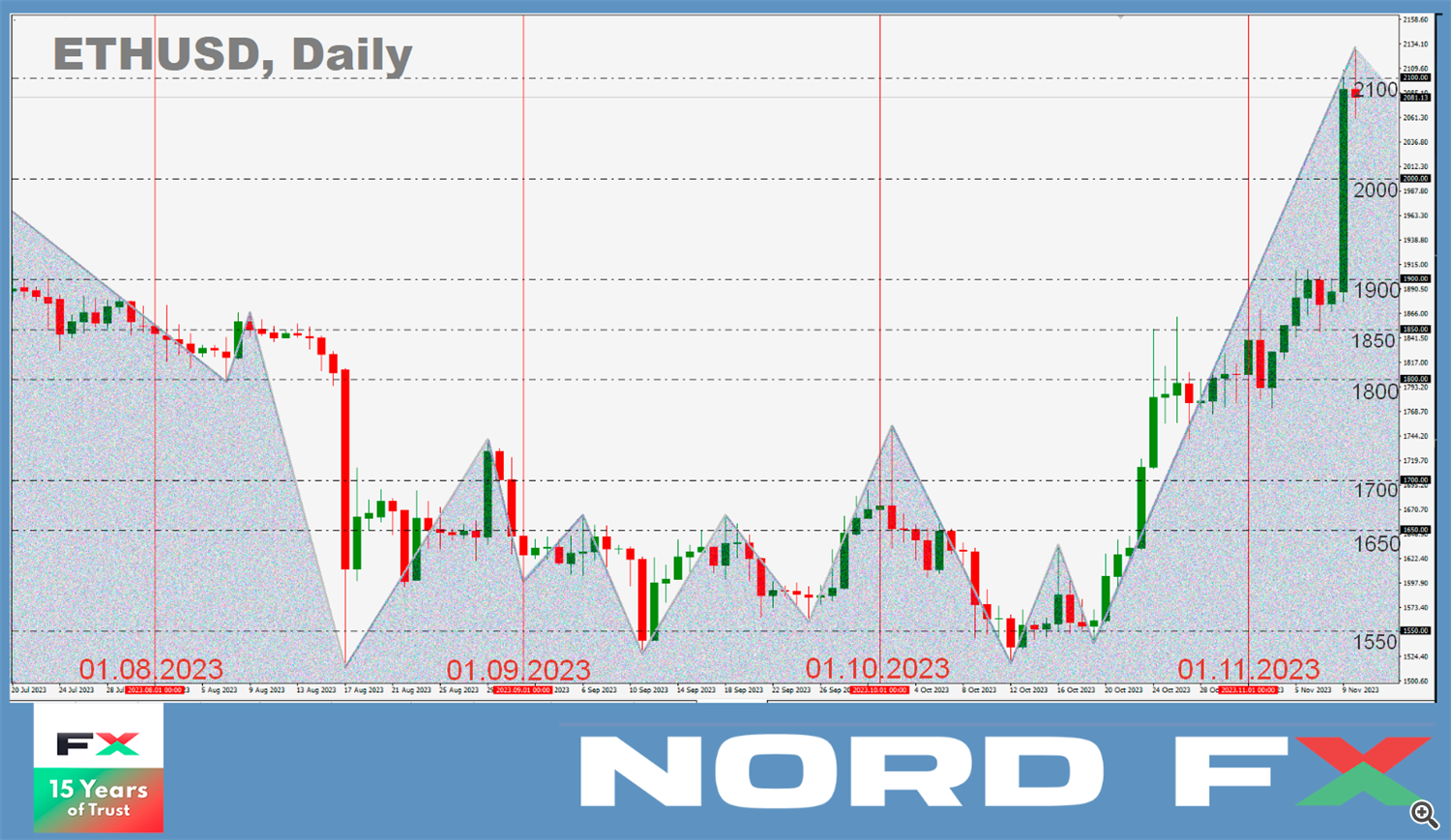 ● Whether Nerayoff and Truth Labs can substantiate their accusations is a big question. For now, the price of ETH is rising and reached a maximum of $2,130. As for the leading cryptocurrency, on Thursday, November 9, BTC/USD broke through the $37,000 resistance and set a local high at $37,948: it last traded there in May 2022.