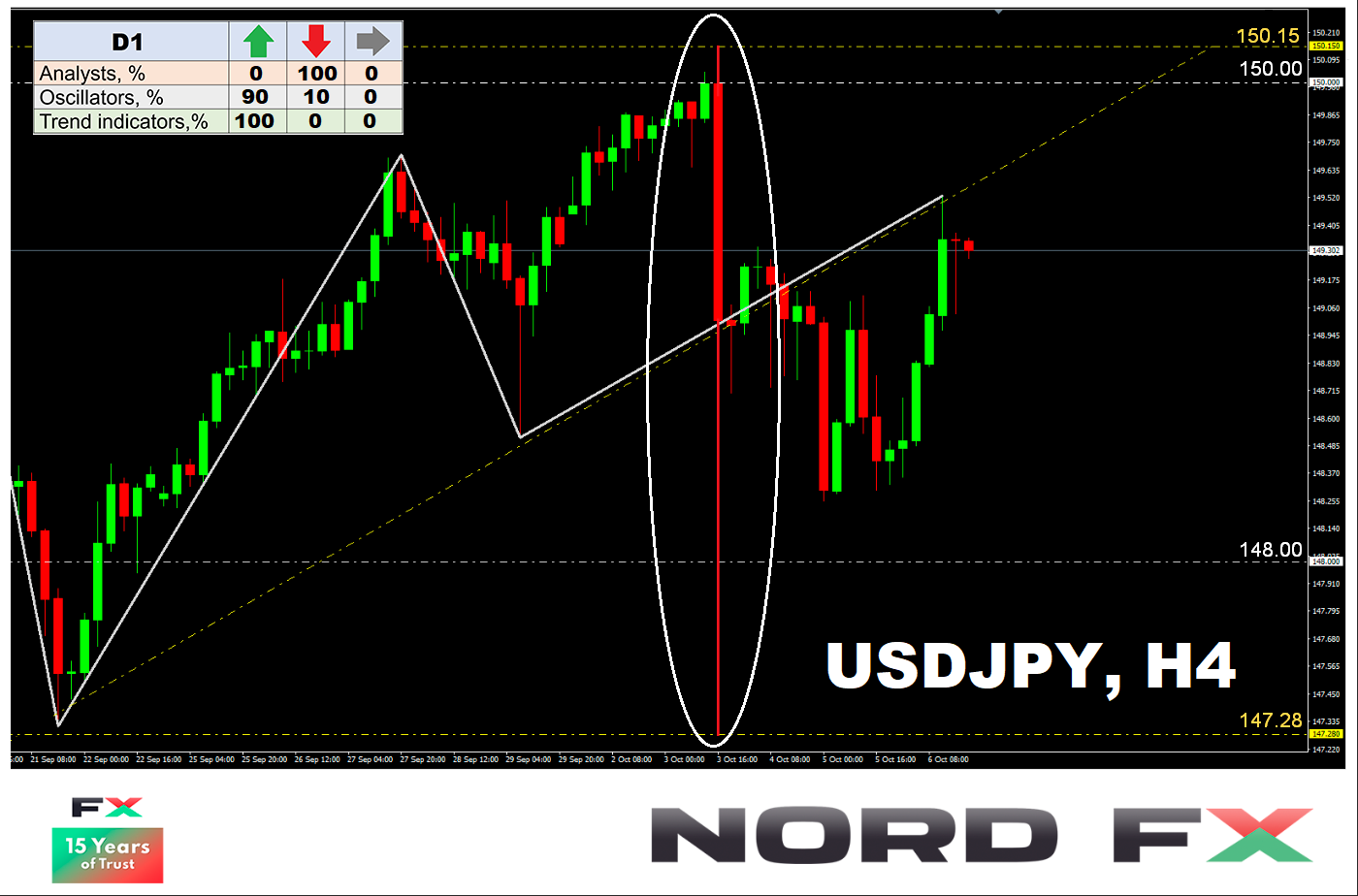 ● We suggested in our previous review that the “magic” number of 150.00 would serve as a signal to Japanese financial authorities to initiate currency interventions. Indeed, after USD/JPY slightly crossed this threshold on Tuesday, October 3, reaching a high of 150.15, the long-anticipated event occurred, within a matter of minutes, the pair plummeted nearly 300 points, halting its freefall at 147.28.