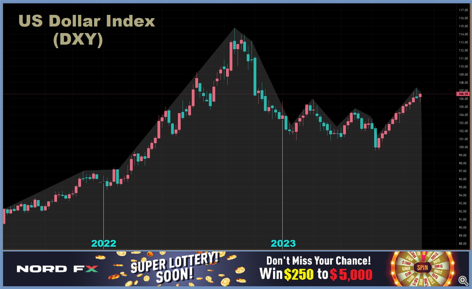 ● At the beginning of last week, the Dollar Index (DXY) continued its decline that began on October 3, while global equity markets experienced growth. The dovish stance of Federal Reserve officials and the falling yields on U.S. Treasury bonds were driving factors. In recent days, the regulators have been actively persuading the market of the likelihood of a “soft landing” for the U.S. economy, suggesting a potentially prolonged pause in the cycle of monetary tightening. For instance, on Wednesday, October 11, Christopher Waller, a member of the Federal Reserve Board of Governors, stated that “tightening in financial markets is doing some of our work for us,” allowing the central bank to maintain a wait-and-see approach.