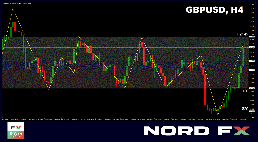● The result of the past five days for GBP/USD, despite the volatility of 310 points, ended up being close to zero. The pair finished the working week at the level of 1.2025, returning to the central zone of the side channel 1.1920-1.2145. The reason for this dynamics is the same as for EUR/USD, since both pairs were actively reacting to what was happening in the US. There were no important macro statistics from the United Kingdom all week until Friday, March 10, when the data on GDP and industrial production for January were released.
