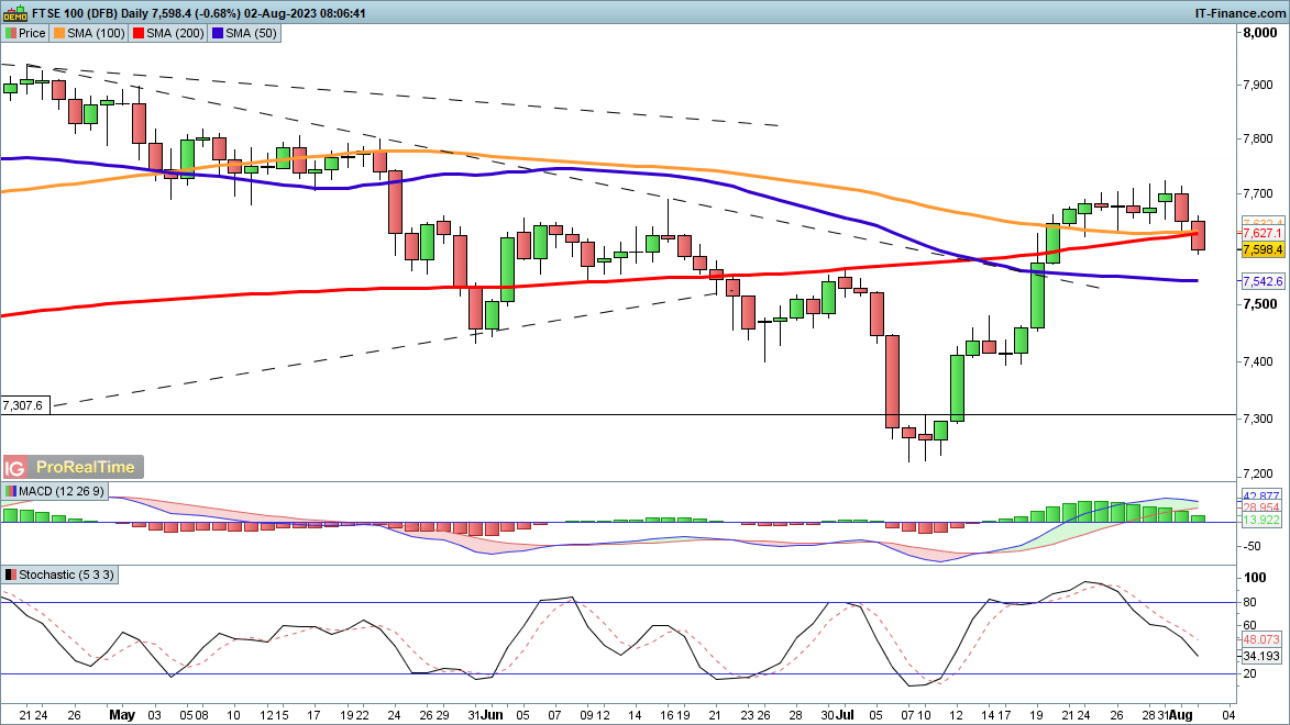 News of a US downgrade did not appear to have much impact on the index, which continues to hold close to recent highs.Further upside continues to target 35,860, then on to 36,465 and then 36,954, this last being the record high from late 2021. It is important to note how overstretched the index is from the 50-day SMA – a pullback could see a drop of around 1500 points and leave the overall uptrend from the May lows intact.