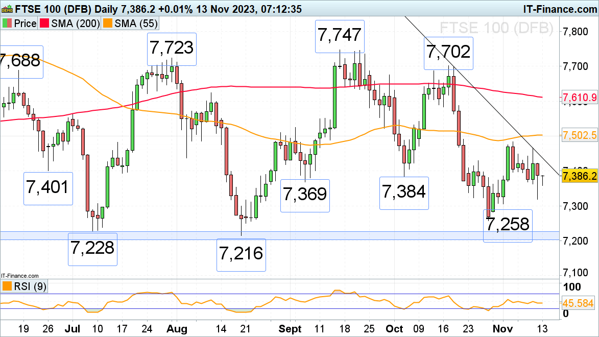 [ad_1] Article by IG Senior Market Analyst Axel Rudolph FTSE 100, DAX 40, Nasdaq 100 Analysis and Charts Download our Q4 Equities trading Forecast Below: Recommended by IG Get Your Free Equities Forecast FTSE 100 tries to begin the week on a positive footing The FTSE 100 has come off Thursday’s 7,466 high amid hawkish