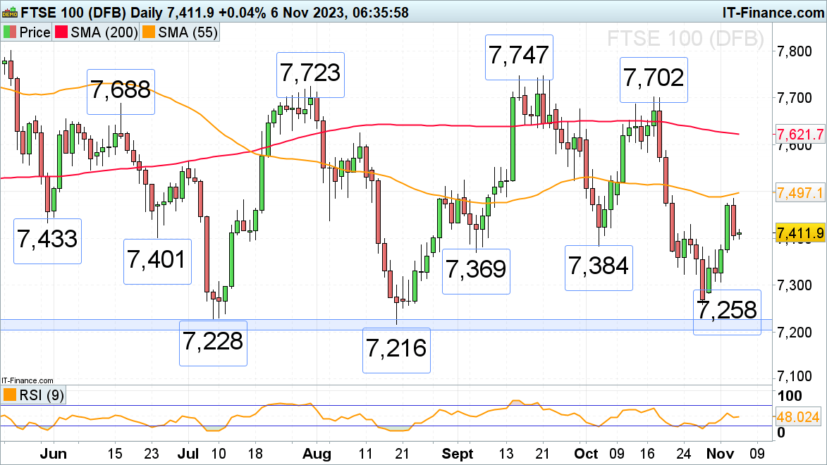 [ad_1] Article by IG Senior Market Analyst Axel Rudolph FTSE 100, DAX 40, S&P 500 Analysis and Charts FTSE 100 hovers above support The FTSE 100 ended last week on a high and managed to rally to 7,484, close to the 55-day simple moving average (SMA) at 7,497, following softer US employment data, rapidly falling