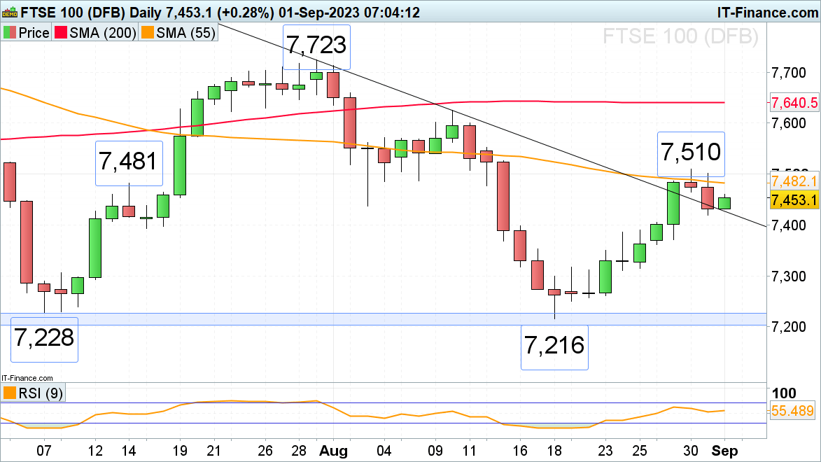 Minor support can now be found along the breached July-to-August downtrend line at 7,425 ahead of more significant support made up of the May, June, and early August lows at 7,437 to 7,401.