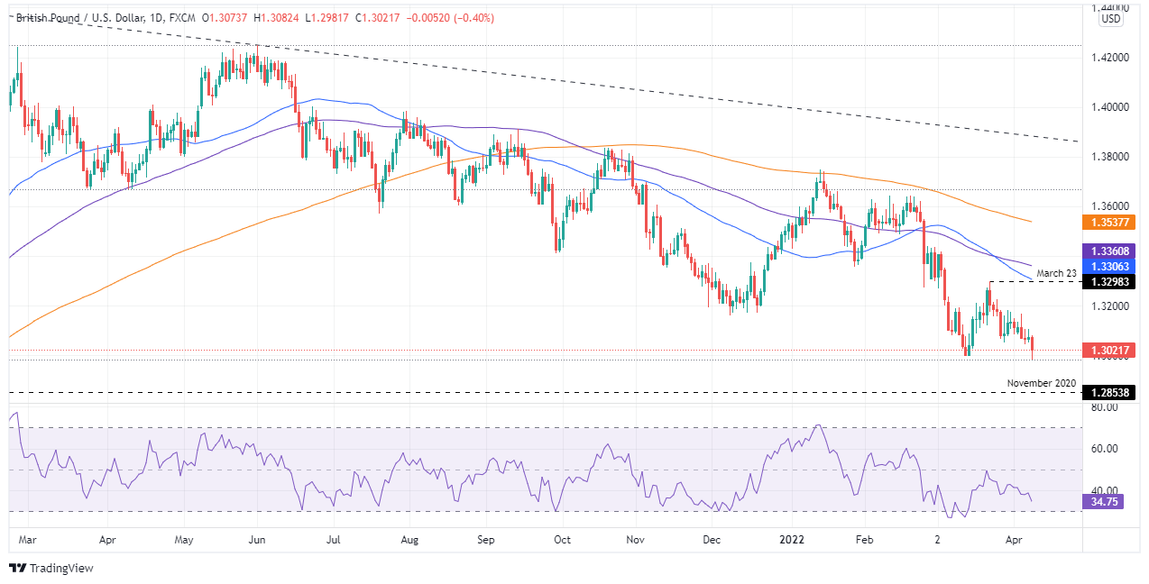 GBP/USD در حال تقویت بیشتر سوگیری نزولی خود است، زیرا شکست آن در چسبیدن به 1.3200، راه را برای آزمایش مجدد رقم 1.3000 باز کرد. شایان ذکر است که علیرغم افت شدید پوند/دلار آمریکا به سمت پایین‌ترین رقم در 17 ماه گذشته، شاخص قدرت نسبی (RSI) در محدوده نزولی در 33.81 قرار دارد، اما فضای کافی برای صرفه‌جویی در آن وجود دارد، بنابراین از کاهش قیمت‌های دیگر خودداری کنید. پایین.