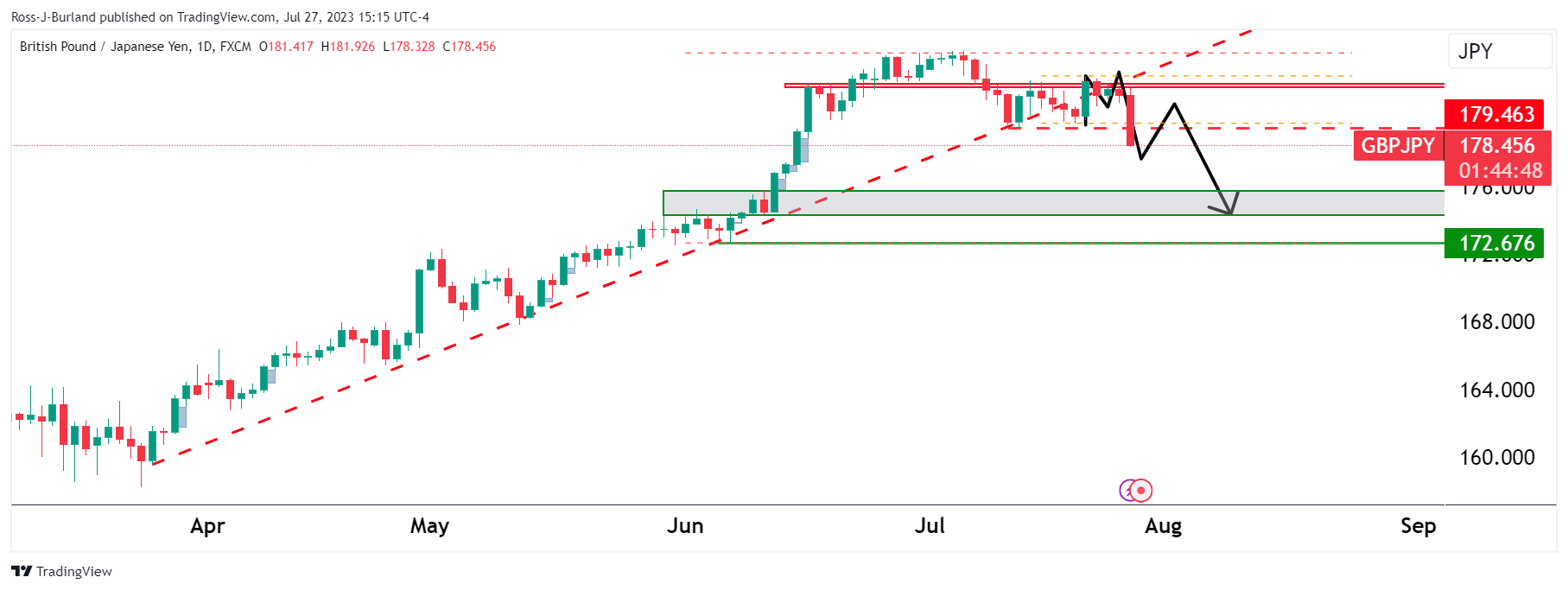 - GBP/JPY drops into a potentially strong area of support in the 177.70/90s as per the hourly structure.