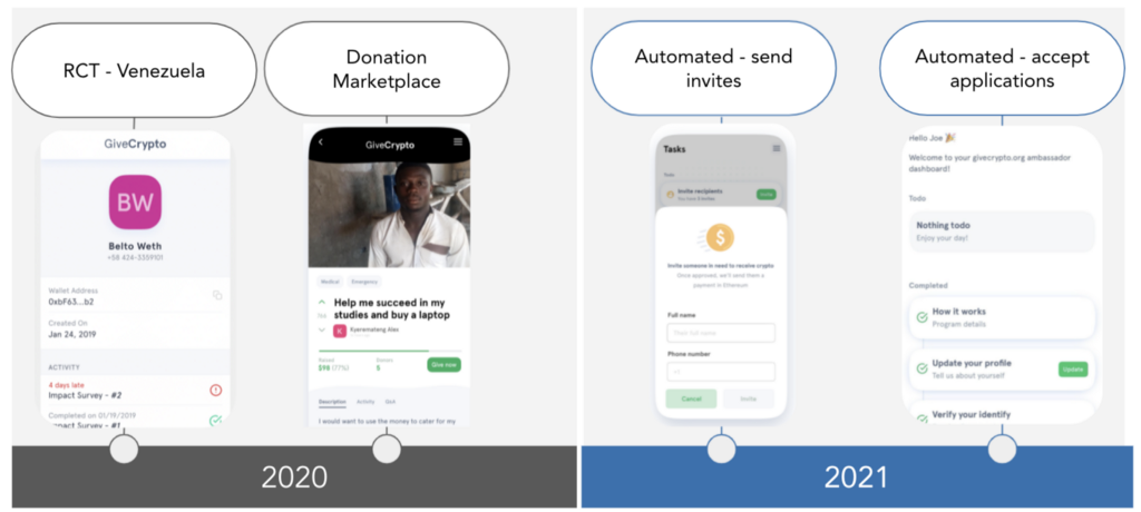 ما برنامه سفیر را در سال 2019 راه اندازی کردیم و نیمه اول سال 2020 را صرف اجرای RCT در ونزوئلا کردیم. ما نیمه دوم سال 2020 را با یک بازار اهدای ارز دیجیتال که شبیه GoFundMe یا DonorsChoose اما کاملا مبتنی بر رمزنگاری است، گذراندیم. در نهایت، این چیزی که ما امیدوار بودیم را محقق نکرد، بنابراین تصمیم گرفتیم در اوایل سال 2021 به برنامه سفیر بازگردیم.