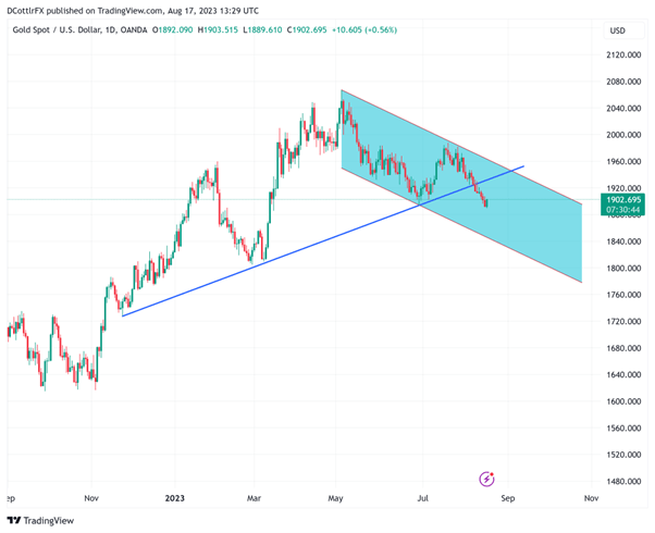 [ad_1] Gold (XAU/USD) Analysis and Chart Gold prices have ticked up despite higher Treasury yields They remain heavy though after three days of declines The $1900 level is in play and its fate will probably be key Recommended by David Cottle How to Trade Gold Gold Prices recovered a little on Thursday following three days