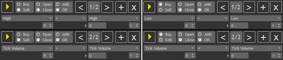 توجه داشته باشید: تنظیمات بالا از نوار فعلی (هنوز تشکیل نشده) استفاده می کند که می تواند برخی از ورودی های نادرست را ارائه دهد. اگر می خواهید از آخرین نوار بسته استفاده کنید، فقط شماره نوار را تغییر دهید 0 به 1 و 1 به 2 در همه مقایسه ها