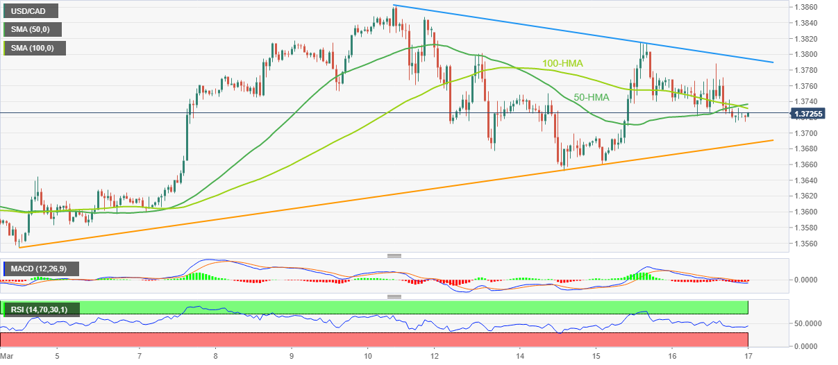 USD/CAD پس از استقبال از خرسها در روز قبل، برای مسیرهای واضح در حدود 1.3720-25 مبارزه میکند. با انجام این کار، جفت Loonie دفاعی میماند و در عین حال شکست روز پنجشنبه از میانگین متحرک 100 و 50 ساعتی (HMA) را حفظ میکند.