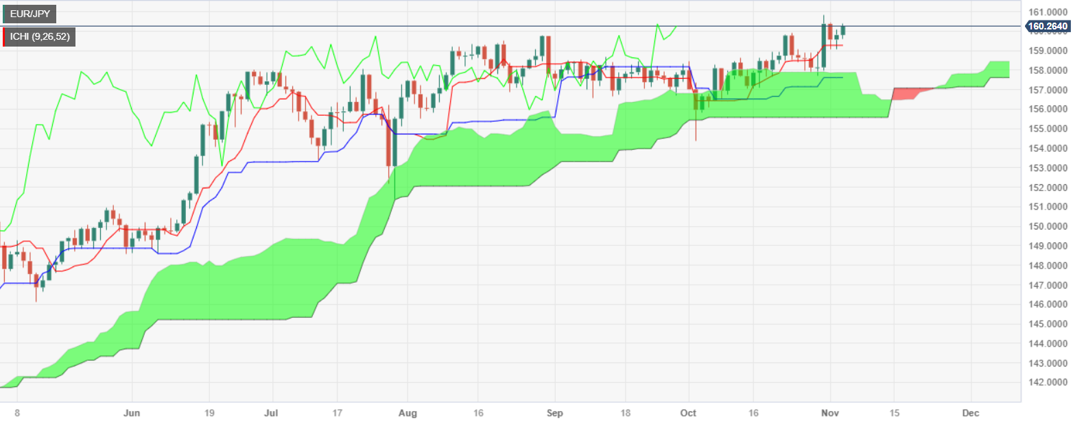 Contrarily, if EUR/JPY drops below the Tenkan-Sen at 159.26, the trend would be skewed to the downside. Next support would emerge at the confluence of the October 30 low and the Tenkan-Sen at around 157.59/69, followed by the bottom of the Ichimoku Cloud at 155.55.