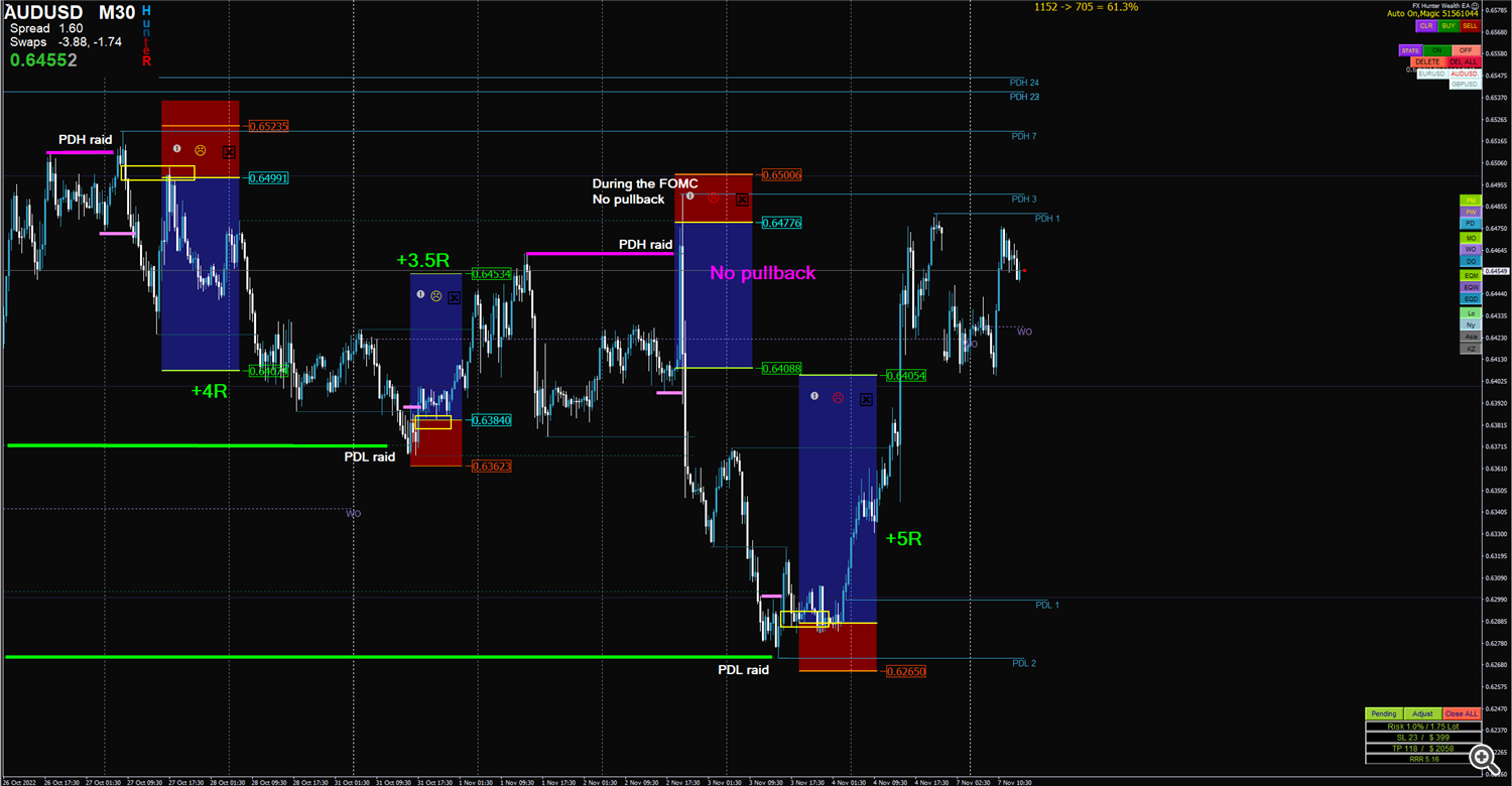 I want to have my life easier, and I want to fully focus just to efficient trading without wasting time by drawing the levels and monitoring the charts for the whole day. So, I have created an ICT Template MT4 that automatically updates the levels and sends mobile push notifications, when the liquidity raid occurs, that is the moment I start to monitor for the potential setup. The indicator starts to print necessary price action elements on M1 and if all the conditions and DXY confluence is confirming my thesis. I’m looking only for the entry on a pullback with 3 possible methods. For effective execution, I’m using Flexible Trade Manager which helps me quickly set the trade with correct risk management and manages my partial close and moves stop loss to be.