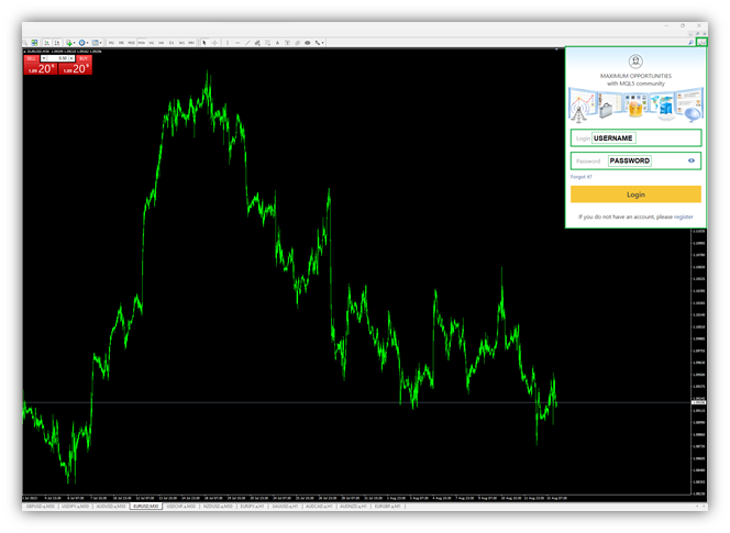 Log in to Metatrader From the upper right part, log in to your MQL5 site account (using “username” and “password”).