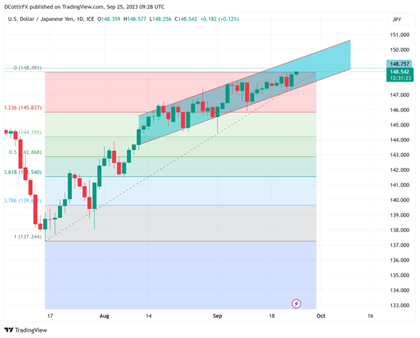The current, well-respected daily chart uptrend channel is an extension of the impressive rise seen since January of this year which has taken USD/JPY up from lows around 127. It currently offers resistance at 149.27, with support at 147.43.