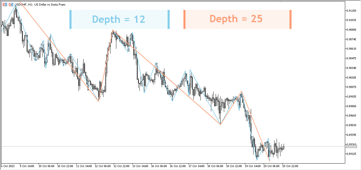 Without going into details, we can say that this parameter is responsible for the magnitude or size of extrema. The larger this parameter, the larger and more significant extrema it connects. In the picture below you can see the difference between depth parameters 12 and 25.