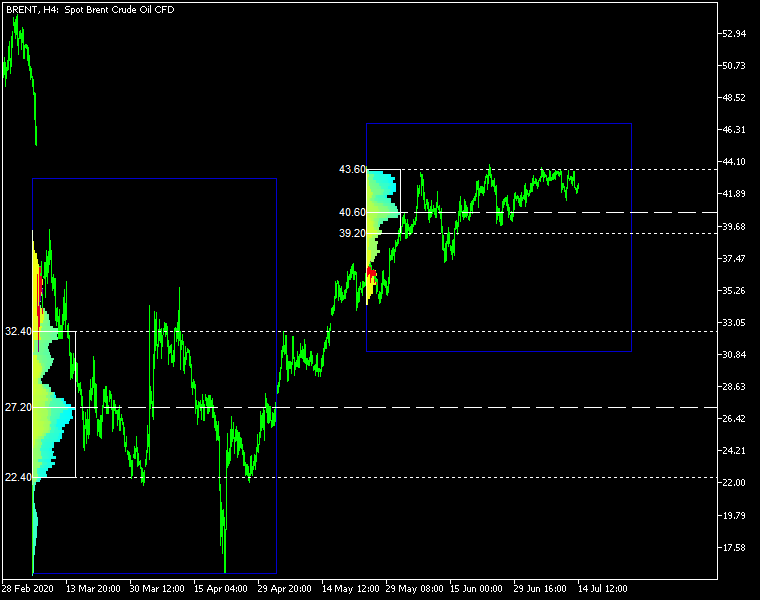 This example demonstrates how the indicator can display a market profile based on the rectangle chart objects freely drawn by a trader. For this to work, a rectangle object’s name has to start with MPR and the Session input parameter has to be set to Rectangle. You can press ‘r’ on your keyboard to add such a rectangle to the chart automatically.