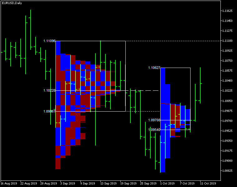 The chart screenshot shows market profiles calculated and displayed for two daily Forex trading sessions. The timeframe is M30 and the right-hand daily session is still in progress. The earliest prices are blue and the latest prices are red. The medians and the value areas are marked with the white lines and display the most important price areas. Traders tend to return to those areas if the volume of the breakout movement is not too high. High-volume breakout out of these areas signifies a real breakout. You can read more about Market Profile in this short e-book: