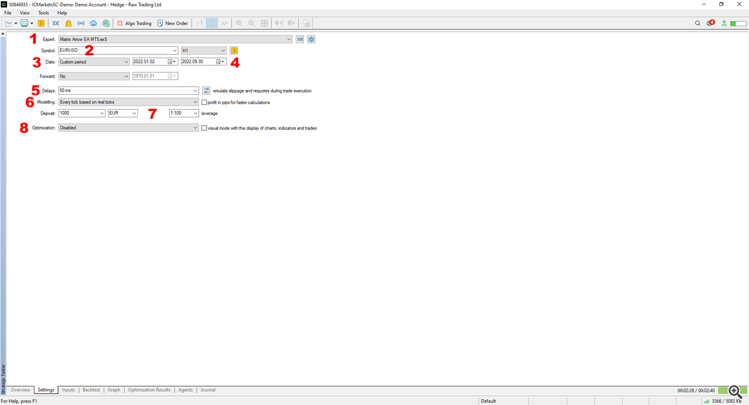 4. ابتدا باید مطمئن شوید که نسخه آزمایشی Matrix Arrow Indicator MT5 و Matrix Arrow EA MT5 را یا اجاره/خرید یا دانلود کرده اید. پس از تایید که شما با باز کردن MT5 >> مشاهده >> تستر استراتژی شروع کنید. سپس روی تب تنظیمات در پایین تستر استراتژی کلیک کنید و از گزینه Expert (1) پیکان Matrix EA MT5 را انتخاب کنید، نمادی را که در مثال ما ابتدا (2) EURUSD را بهینه خواهید کرد و در زیر سفارشی را انتخاب کنید. گزینه period (3) را در قسمت Date قرار دهید و دوره ای را که به صورت دستی بهینه می کنید تنظیم کنید (4). پیشنهاد من این است که برای نزدیک شدن به شرایط فعلی بازار، یک دوره 6، 9 یا 12 ماهه را انتخاب کنید. آزمایش یا بهینه سازی سال ها قبل به هیچ وجه به شما کمکی نمی کند. در مثال زیر من برای دوره 9 ماه گذشته بهینه سازی می کنم. در پایین تر، تاخیر معاملات آزمایشی خود را انتخاب کنید (5)، من همیشه 50 میلی ثانیه در آن فیلد قرار می دهم زیرا چیزی به نام سرعت اجرای کامل وجود ندارد. سپس در قسمت Modeling باید هر تیک بر اساس تیک های واقعی (6) را انتخاب کنید، زیرا این گزینه بالاترین کیفیت تیک است، در زیر سپرده اولیه، ارز و اهرمی را که برای تست ها و بهینه سازی های خود استفاده خواهید کرد (7) و در قسمت Optimization تنظیم کنید. فیلد Disabled (8) را انتخاب می کنید تا یک آزمایش ساده از دوره 9 ماهه از پیش تعریف شده را اجرا کنید تا تستر استراتژی MT5 خود را مجبور کنید که هر تیک را با بالاترین کیفیت بر اساس داده های تیک های واقعی برای بهینه سازی آینده شما دانلود کند.