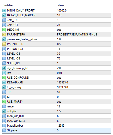 [ad_1] If the initial deposit is $1000 on a HIGH RISK micro account use the parameter settings below: Currency pairs: GBP/USD Timeframe: H4 Leverage: 1:500 Swap free account (forex robot will hold floating loss for weeks or even months) Parameter settings for GBP/USD, H4: MINIM_DAILY_PROFIT = Minimum daily profit = 10000 BATAS_FREE_MARGIN = Free margin limit = 10 JAM_ON = The robot starts