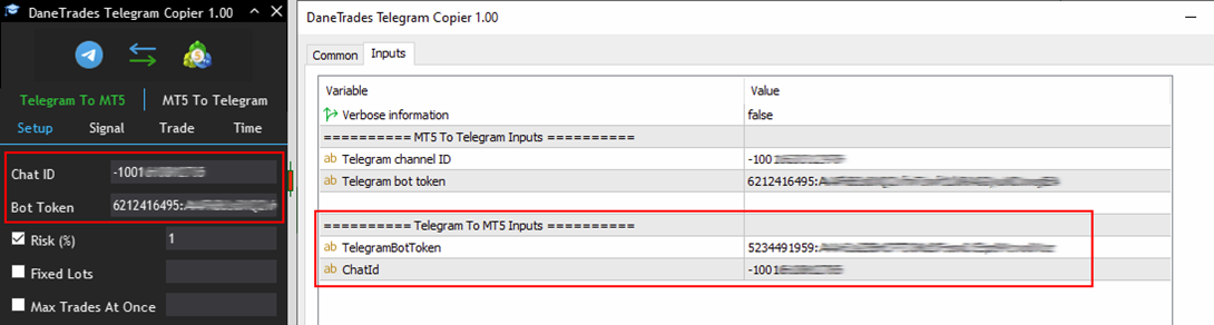 If you are copying signals from someone else’s Telegram they will need to give you their Bot Token. You can get the Chat ID by going to step 2. Get Telegram Chat ID. Below or ask the Telegram Owner. Copy these both into the Telegram to MT5 to get connected.