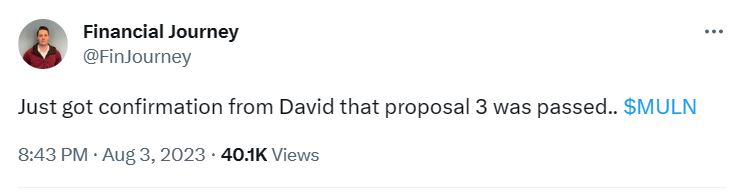 Mullen has not yet reported or filed any documents with the Securities & Exchange Commission (SEC) regarding the details of its August 3 shareholder meeting. Rumors have been circulating online, however, that Proposal 3 passed. This would allow Mullen to effect a reverse stock split at any ratio between 1-for-2 and 1-for-100. The company needs to place its share price above $1 for 10 consecutive trading sessions by September 5 in order to satisfy the NASDAQ Exchange’s bylaws.