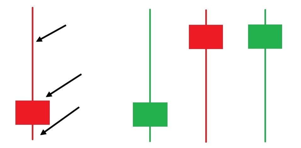 – Body: This is the zone between the opening and closing prices. The body of a candlestick must not be longer than 1/3 of the length of the candlestick bar. The opening and closing prices of adjacent bars are close to each other or maybe equal.
