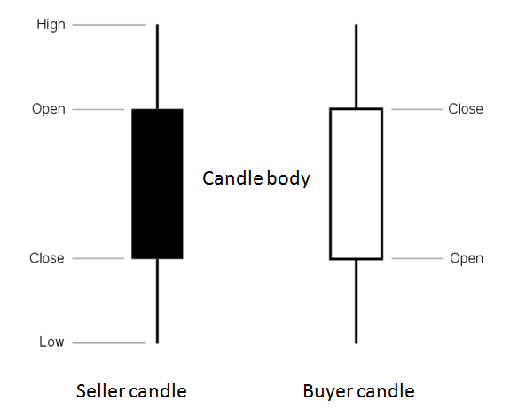 • The seller candle, shown by a black, or sometimes red, body tells us that sellers won the battle of the trading day. This is because the closing price level is lower than the opening price level.