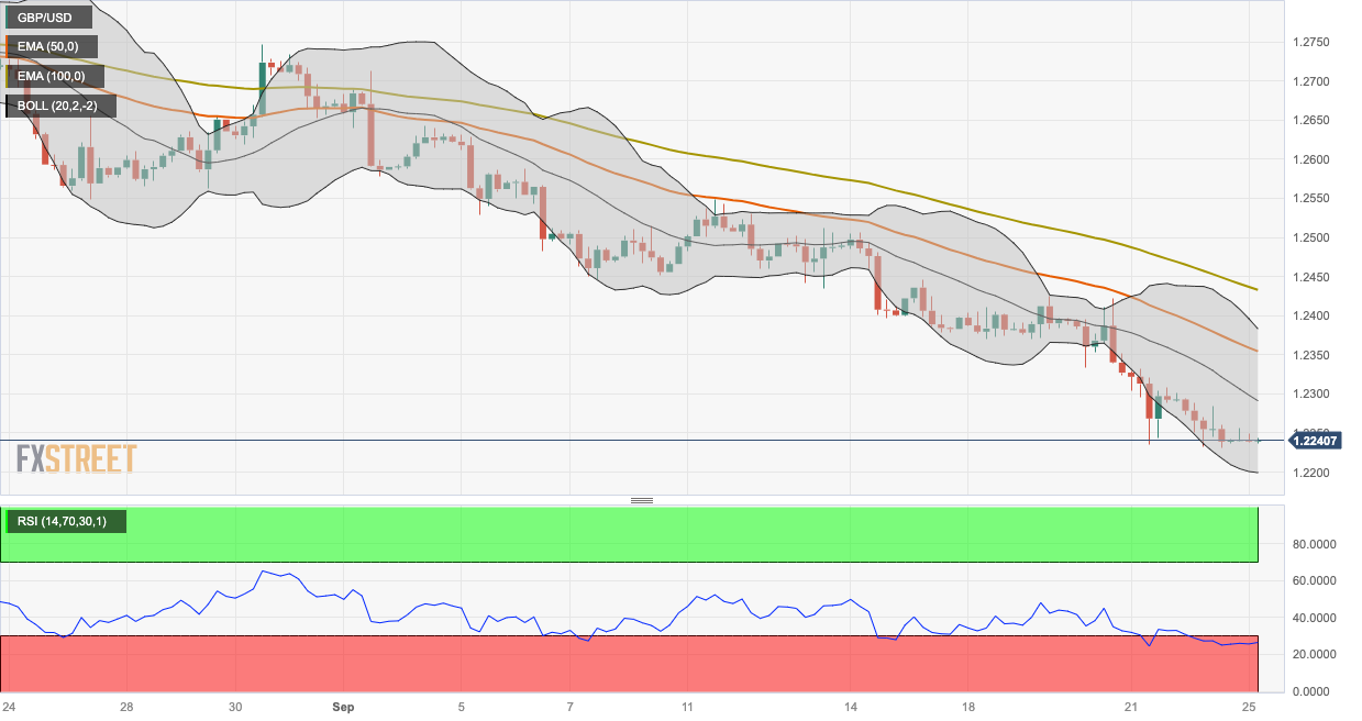 [ad_1] Share: GBP/USD remains under selling pressure amid the Fed’s hawkish stance. The pair holds below the 50- and 100-hour EMAs on a four-hour chart. The oversold RSI condition indicates that further consolidation cannot be ruled out. The immediate resistance level will emerge at 1.2290; 1.2200 will be the critical support level. The