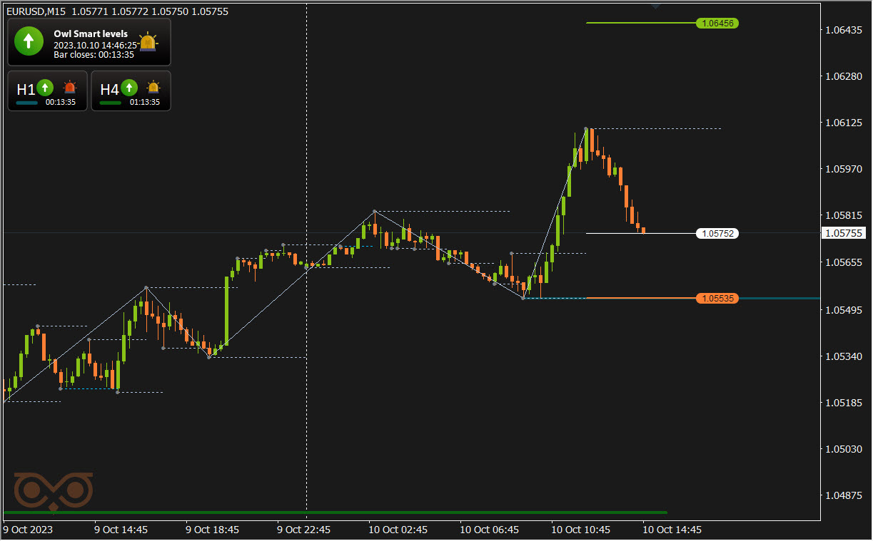 For convenience and timely receipt of signals I use the Owl Smart Levels Indicator. The main trading timeframe is M15, while the H1 and H4 timeframes are used to confirm the trend direction of the higher timeframe.