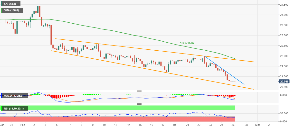 با این حال، شکل گیری نموداری با شیب نزولی در حال گسترش روند مگافون، که از اوایل فوریه ادامه دارد، به سیگنال های MACD نزولی می پیوندد تا فروشندگان XAG/USD را امیدوار نگه دارد.