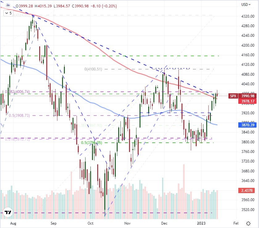 پس از تعطیلات سال جدید در جمعه هفته گذشته، من نظرسنجی را منتشر کردم تا نظر معامله گران را در مورد اینکه آیا ریسک اشتها به طور کامل تا نقطه افزایش پایدار بهبود یافته است یا خیر، منتشر کردم. با این حال، پرسیدن آن سوال مبهم و تصویر کلان معمولاً برای بسیاری دشوار است. بنابراین من آن را به معیار متقاعد کردن مورد علاقه‌ام برای احساسات خلاصه کردم و زمینه فنی را اضافه کردم که شرکت‌کنندگان می‌توانند درباره آن نظر بدهند. بر اساس نتایج، 42 درصد از شرکت کنندگان بر این باور بودند که S&P 500 پس از سبقت گرفتن از میانگین متحرک 200 روزه، به زیر 3900 باز خواهد گشت. 34 درصد انتظار صعود مداوم به بالای 4000 را داشتند. و 24 درصد انتظار ریز ریز کردن در این هفته. این ترکیب نسبتاً یکنواختی از انتظارات است که همه در نظر گرفته شده اند. من شخصاً به دنبال یک جریان بنیادی ملموس و توانمند برای هدایت توده های سوداگر هستم. رویدادهای قابل توجهی از مناطق مختلف یا از طریق یک لنز کمتر آشکار وجود دارد، اما هیچ چیز به راحتی به من نمی رسد. این بدان معناست که یا برخی از شگفتی‌ها می‌آیند تا کنترل را در دست بگیرند یا گمانه‌زنی‌ها از طریق مجموعه‌ای از انگیزه‌ها ایجاد می‌شوند. هیچ یک از این دو درس برای ارزیابی احتمالات برای من جذاب نیستند. بنابراین، من یک زبانه نزدیک و چشم انداز متعادل در مورد پیشرفت را در حین آشکار شدن آن حفظ خواهم کرد.