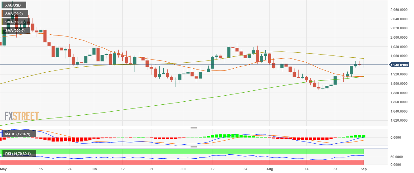 [ad_1] Share: XAU/USD rose to a daily high of $1,952 and then got rejected by 100-day SMA, retreating to $1,940. US yields initially dropped after mixed US NPFs but recovered after strong US ISMs from August. At the end of the week, the Gold spot price XAU/USD erased daily gains, retreating towards the