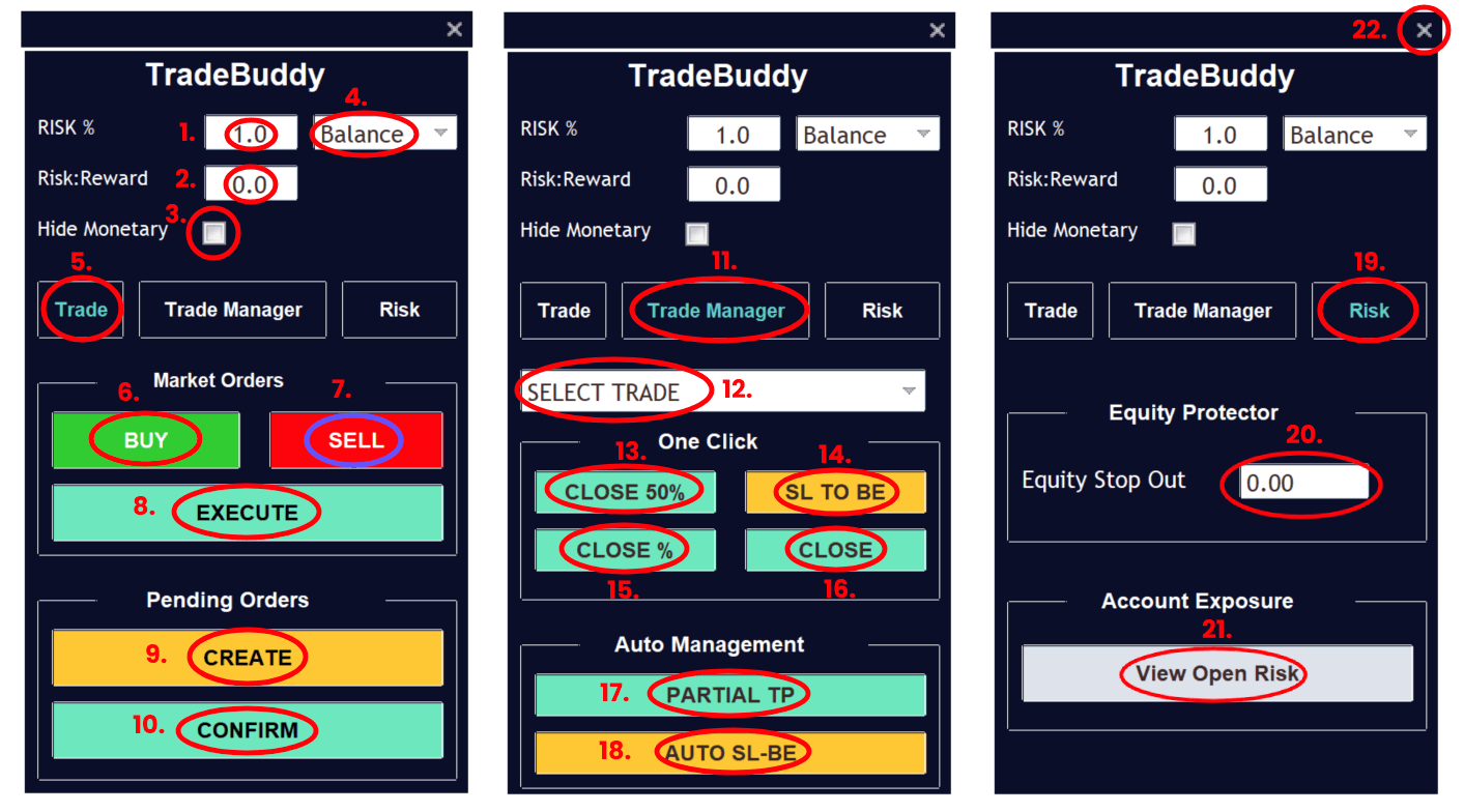 The One Click section will instantly move your Stop Loss to Breakeven, close half your trade, close a custom percentage of a trade (e.g. 10%, 20% etc) and even close trades entirely