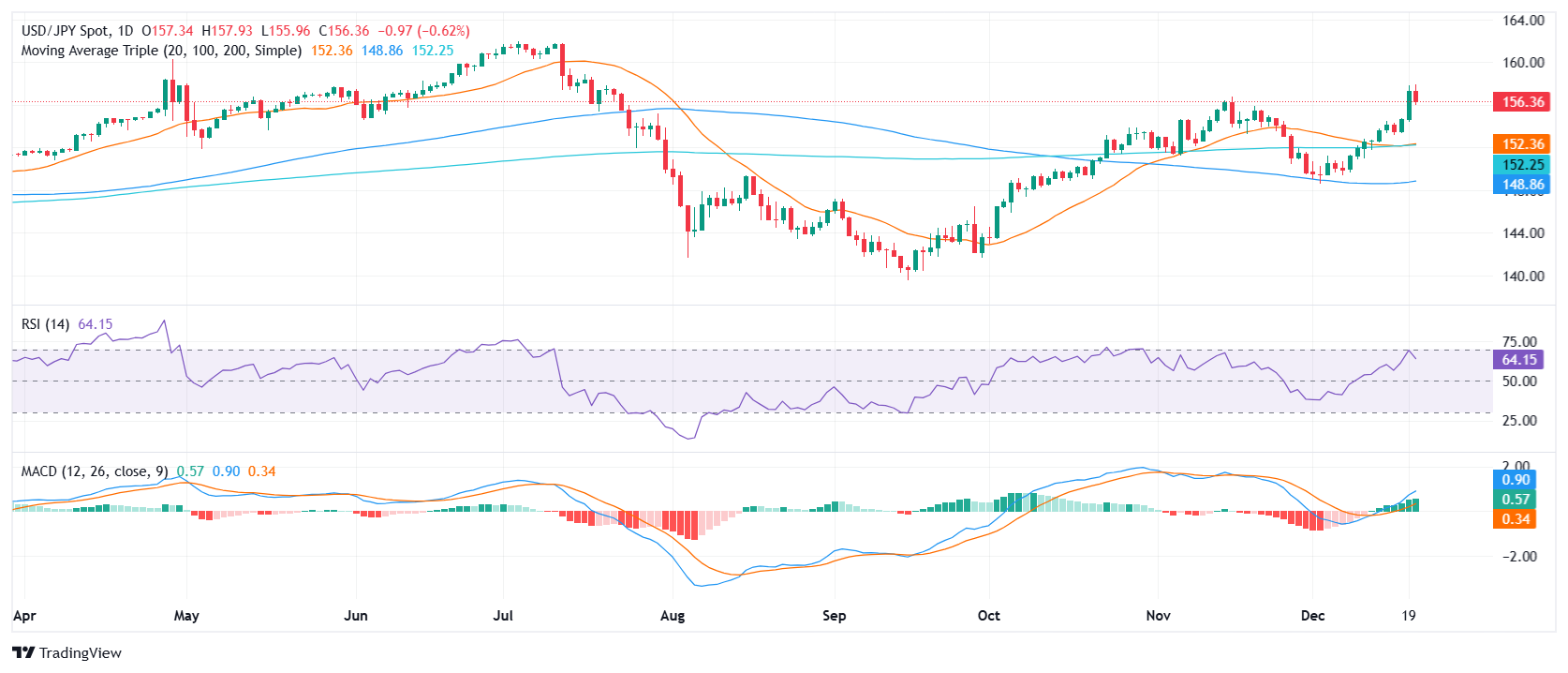 عقب نشینی USD/JPY تا سطح 156.50 نشان دهنده کاهش در حرکت صعودی است، با شاخص های فنی کلیدی که از شرایط مختلط خبر می دهد. شاخص قدرت نسبی (RSI) در آستانه خرید بیش از حد 70 رد شد که نشان دهنده فرسودگی احتمالی در روند صعودی است. در همین حال، هیستوگرام واگرایی میانگین متحرک همگرایی (MACD) به چاپ نوارهای سبز رو به افزایش ادامه می دهد که منعکس کننده حرکت صعودی مداوم است.