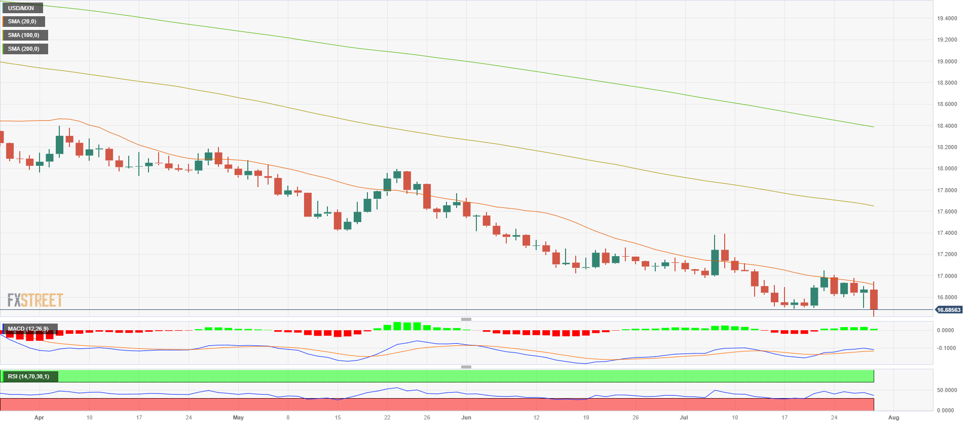 [ad_1] Share: USD/MXN printed a fresh cycle low on Friday of 16.62 and is poised to close a 1.70% weekly loss. Core US CPI retreated to 4.1% YoY in June. Falling US yields limit the Greenback’s advance as markets start to place bets on the September meeting. On Friday, the USD/MXN pair fell