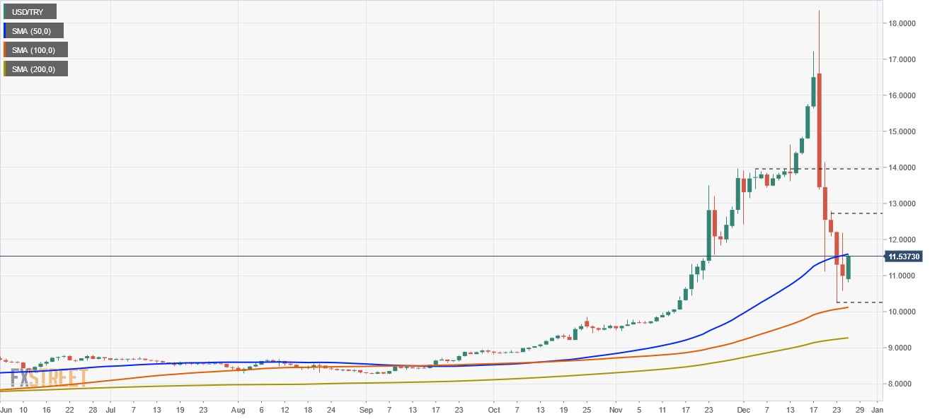 لیر ترکیه در طول روز تضعیف می شود و در طول جلسه نیویورک در زمان نوشتن این مقاله در 11.4100 معامله می شود. با وجود گسترش مداوم فشار Omicron در سرتاسر جهان، احساسات بازار همچنان خوشبینانه است و S&P 500 به بالاترین سطح چاپ تاریخ خود رسیده است.