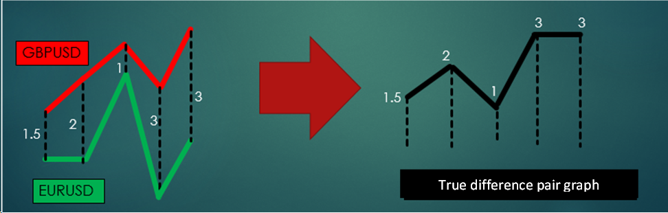 When we SellBuy (Sell GBPUSD and Buy GBPJPY at the same time) and afterwards GBPUSD graph decrease 3 pip and GBPJPY graph decrease 1pip. It means that we earn profits 2 pip (3-1=2). Let’s take a look at True Difference Pair graph. It’s also decrease 2 pip (Because distance between GBPUSD graph and GBPJPY graph decrease 2 pip).